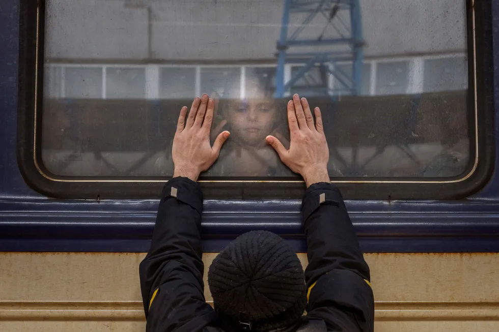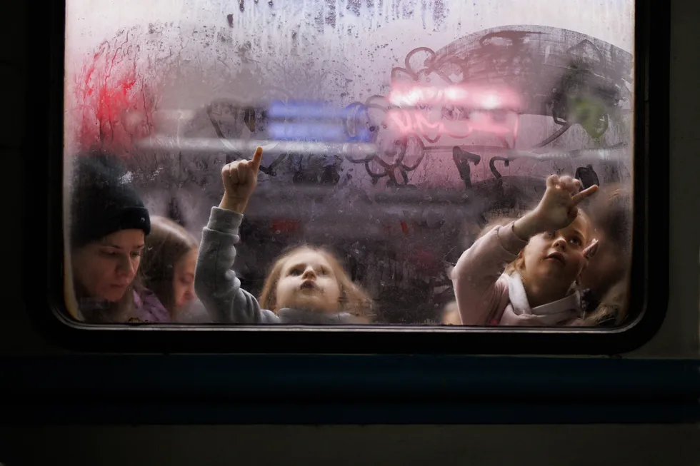 Աղջնակները նկարում են Լվովի երկաթուղային կայարանի գնացքի վագոններից մեկի պատուհանին։ Այդ ընթացքում Լվովը դարձավ ուկրաինացի փախստականների հիմնական տարանցիկ կետը Եվրոպայի ճանապարհին՝ հիմնականում Լեհաստանի․ 2 մարտի, 2022 թ