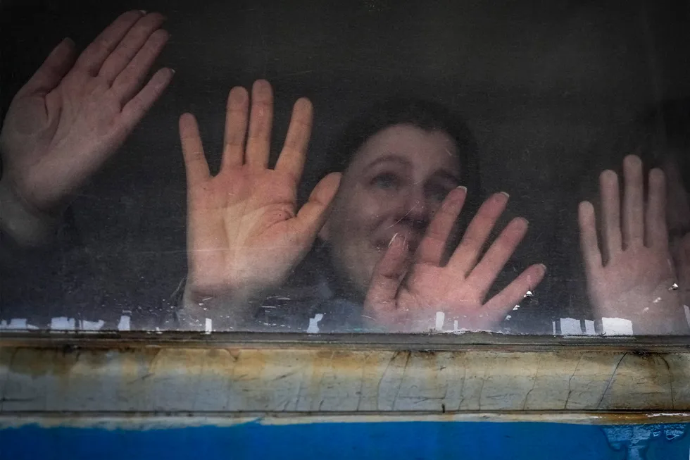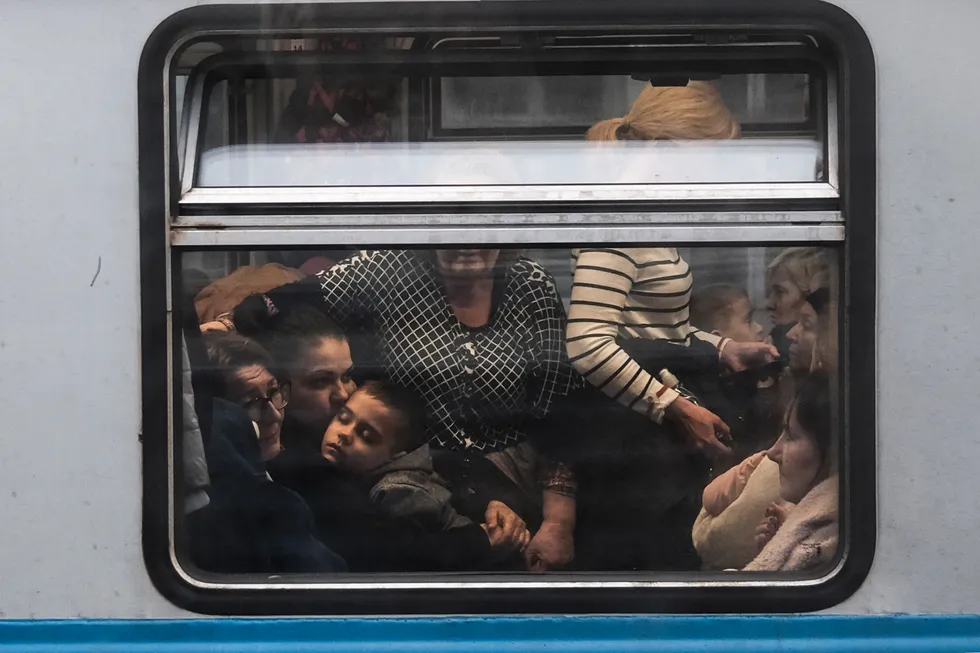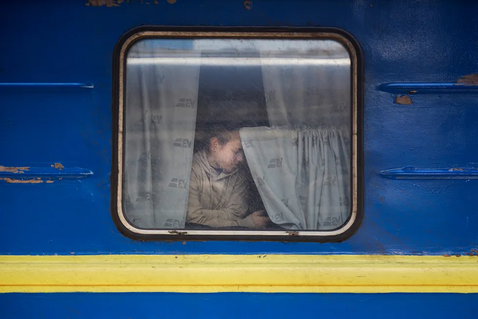 Կինը երեխաների հետ գնում է Լվովից․ Կադրն արվել է հակառակ ուղղությամբ՝ դեպի Լվով լեհական Պշեմիսլ շարժվող գնացքից։ Շատ ուկրաինացիներ որոշել են վերադառնալ իրենց երկիր՝ պատերազմի ժամանակ իրենց հարազատներին պաշտպանելու համար։ Պշեմիսլ, Լեհաստան, 4 մարտի, 2022 թ