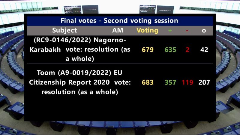 Եվրոպական խորհրդարանը ընդունեց «Լեռնային Ղարաբաղում մշակութային ժառանգության ոչնչացման մասին» բանաձևը: Բանաձևն ընդունվել է 635 կողմ, 2 դեմ և 42 ձեռնպահ ձայներով: