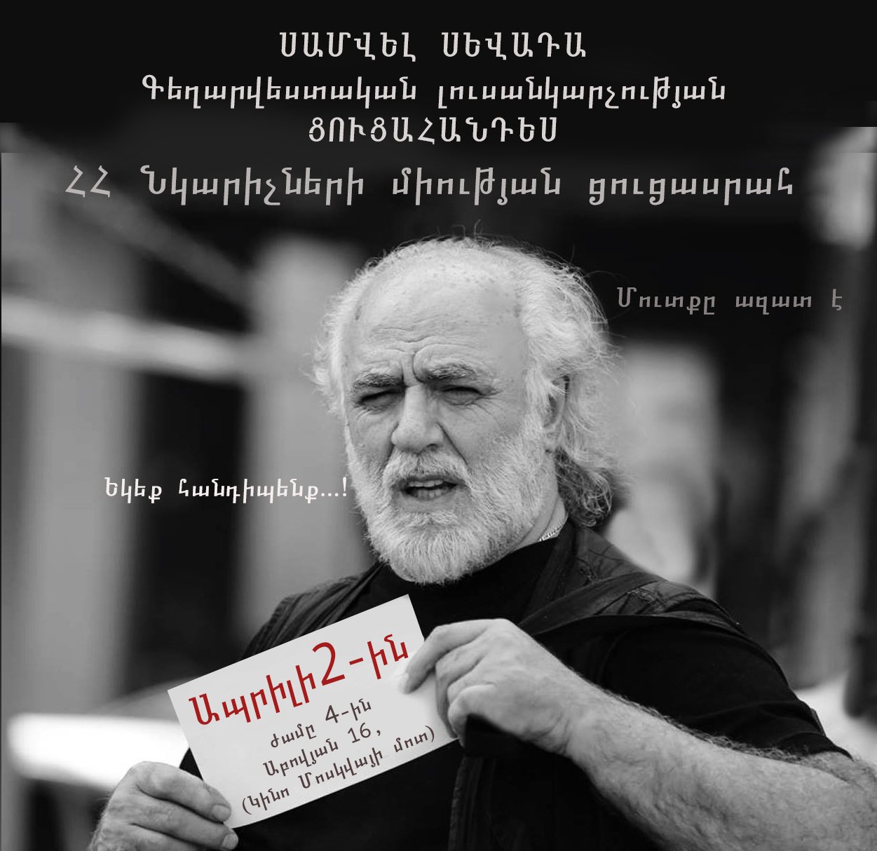 «ԳՐԵՔ ԽՆԴՐԵՄ ՁԵՐ ՍՐՏԻ ՈՒ ՄՏՔԻ ԴԱՎԹԱՐՈՒՄ։ Ներկայացնում եմ 150 գեղարվեստական լուսանկարչության նմուշներ: Եկեք խնդրեմ, հանդիպենք, շփվենք, ծանոթանանք մոտիկից և վեջապես դիտենք, քննարկենք ցուցահանդեսը, որի վրա տարիներով եմ աշխատել»,- գրել է արվեստագետը։