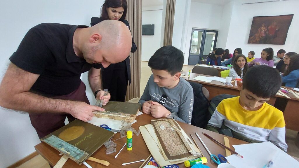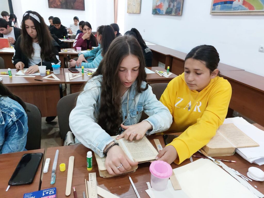 Ցուցադրությունն ուսումնասիրելուց հետո աշակերտները մասնակցում են գործնական առաջադրանքներին, որոնց ընթացքում ծանոթանում են ձեռագրերի վերականգնման արվեստին, ապա վերականգնման բաժնի մասնագետի հետ վերականգնում են իրենց հետ բերած գրքերը։