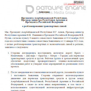 2. Կետ 1-ով սահմանված երկաթուղային գծի վերականգնումից հետո կողմերը բացում են երկաթուղային հաղորդակցությունը Հայաստանի, Ադրբեջանի և Ռուսաստանի միջև, ինչպես նաև այլ ուղղություններով բեռների և տրանսպորտային միջոցների տեղափոխումն ապահովելու համար, այդ թվում՝ երրորդ երկրների երկաթուղային ենթակառուցվածքները օգտագործելու միջոցով: