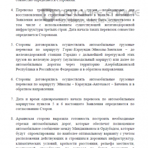 5. Կողմերը պայմանավորվել են իրականացնել ավտոմոբիլային բեռնափոխադրումներ Գորիս-Քարահունջ-Էյվազլի-Զանգիլան-մինչև Հորադիզի երկաթուղային կայարան ուղղությամբ այդ բեռների հետագա տեղափոխման համար երկաթուղային ճանապարհով կամ հետագայում Ադրբեջանի Հանրապետությունից դեպի Ռուսաստանի Դաշնություն տանող ավտոմոբիլային ճանապարհով և հակառակ ուղղությամբ: