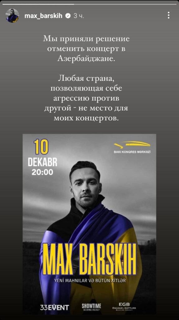 Ուկրաինացի երգիչ Մաքս Բարսկիխը չեղարկել է իր համերգը, որը պետք է կայանար Ադրբեջանում: