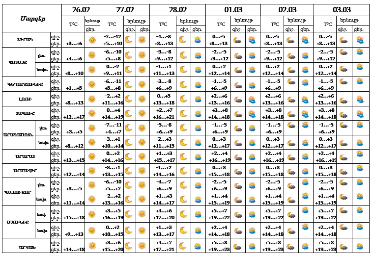 Ըստ աղբյուրի՝ փետրվարի 26-ի ցերեկը, 27-28-ին, մարտի 1-3-ին սպասվում է առանց տեղումների եղանակ։