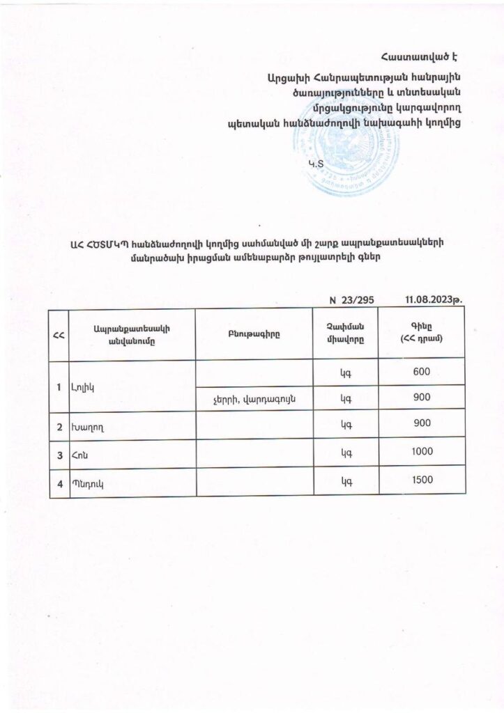 ԼՂ հանրային ծառայությունները և տնտեսական մրցակցությունը կարգավորող պետական հանձնաժողովը սահմանել և վերանայել է մի շարք ապրանքատեսակների մանրածախ իրացման ամենաբարձր թույլատրելի գները՝ օգոստոսի 11-ի դրությամբ: