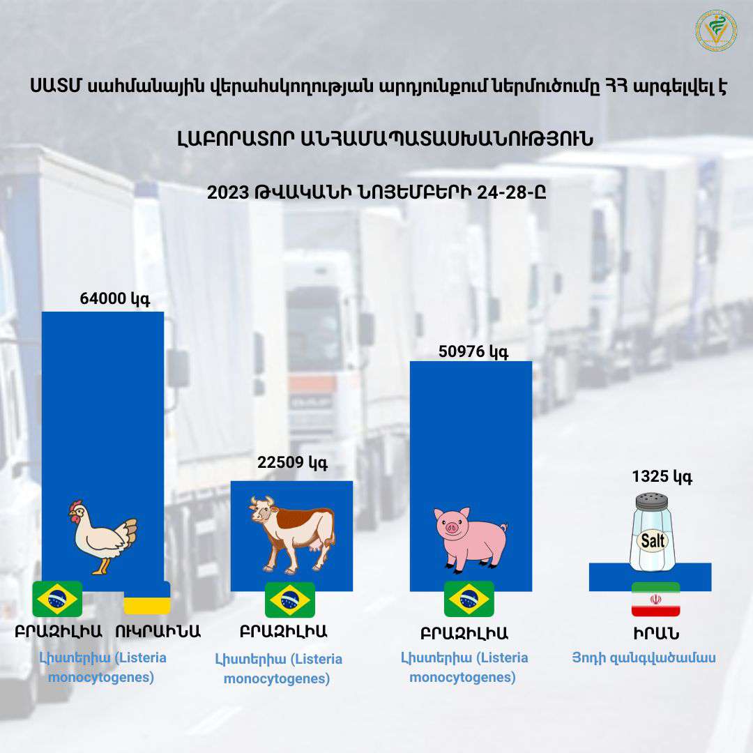 – Բրազիլիայից թռչնամիս՝ 64000 կգ, լիստերիա (Listeria monocytogenes) ցուցանիշով։