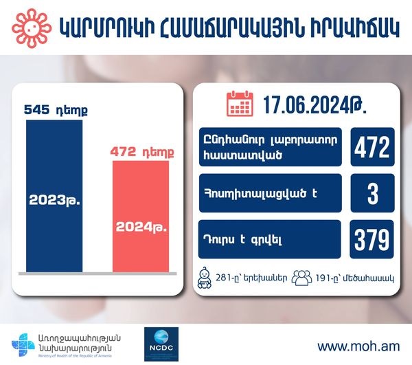 Ըստ այդմ՝ 2024-ին հաստատվել է կարմրուկով վարակման 472 դեպք, որից 281-ը՝ երեխա, 191-ը՝ մեծահասակ: 3 մարդ հոսպիտալացված է: