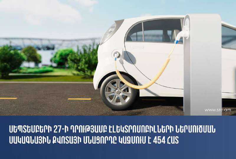 Պետական եկամուտների կոմիտեն տեղեկացնում է, որ 2024 թ. սեպտեմբերի 27-ի դրությամբ ԵԱՏՄ ԱՏԳ ԱԱ 8703 80 000 2 ծածկագրին դասվող էլեկտրական շարժիչով տրասնպորտային միջոցների 0 տոկոս ներմուծման մաքսատուրքի դրույքաչափի քվոտայի շրջանակում ներմուծման սակագնային քվոտայի մնացորդը կազմում է 454 հատ։