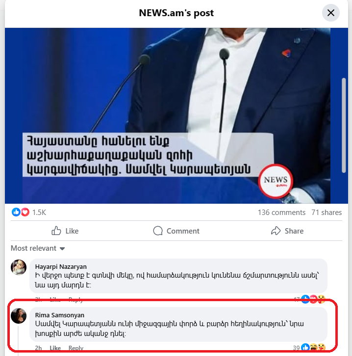 «Փաստերի ստուգման հարթակի» ուշադրության կենտրոնում են հայտնվել մի քանի տասնյակ ակտիվ օգտահաշիվներ (ցանկը թարմացվում է*), որոնք հիմնականում հանդես են գալիս Սամվել Կարապետյանին աջակցող մեկնաբանություններով՝ մեծ լսարան ունեցող ԶԼՄ-ների ֆեյսբուքյան էջերում։