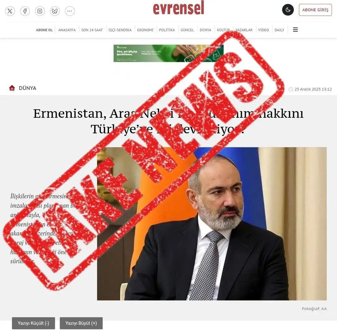 Տվյալ հրապարակումը հստակ տեղավորվում է Հայաստանի դեմ ուղղված համակարգված ապատեղեկատվական արշավների շրջանակում և նպատակ ունի կանխամտածված կերպով մոլորեցնել հանրությանը, խեղաթյուրել տարածաշրջանային գործընթացների իրական պատկերը՝ ներկայացնելով կեղծ ու մոլորեցնող լույսի ներքո։ Փաստեր ստուգող մի շարք պատասխանատու լրատվամիջոցներ արդեն արձագանքել են՝ մեր կողմից ստանալով պաշտոնական պարզաբանումներ և հրապարակելով հերքումներ։ Նման մասնագիտական մոտեցումը ողջունելի է։ Միևնույն ժամանակ խիստ մտահոգիչ է, որ որոշ լրատվամիջոցներ շարունակում են առանց որևէ ստուգման վերարտադրել և տարածել ակնհայտ կեղծ տեղեկատվություն՝ փաստացի դառնալով այդ ապատեղեկատվական արշավների կամավոր կամ ակամա մասնակից։