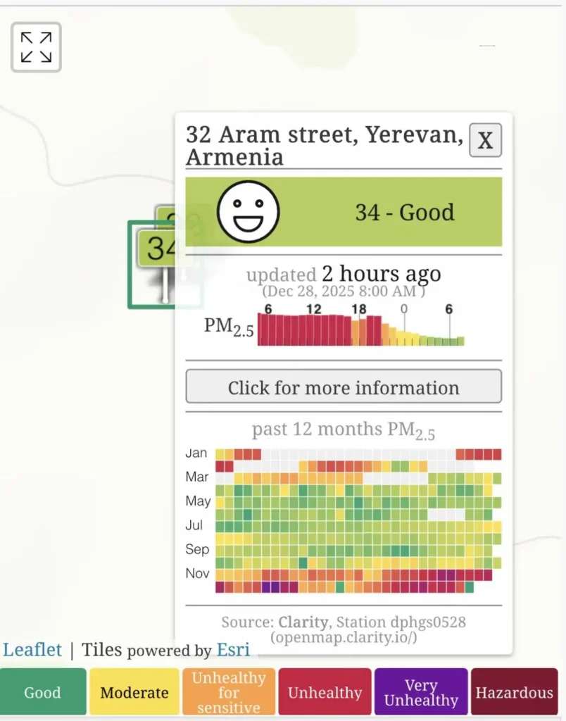 «Սիրելի երևանցիներ, շնորհավորում եմ այս տարվա առաջին ձյունը։ Տեղադրում եմ նաև օդի որակի ցուցանիշը, որն այսօր բարելավվել է տեղացած ձյան ազդեցությամբ։ Պետք է հիշել, որ այս ցուցանիշը փոփոխվում է եղանակային պայմաններից կախված։