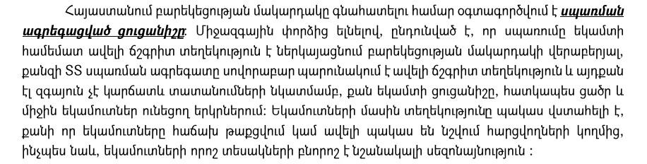 Եվ թեև այս դեպքում խոսքը մեկ անձին բաժին ընկնող ամսական միջին սպառման մասին է, ոչ թե եկամուտների, Հայաստանի վիճակագրական կոմիտեն ընդգծում է, որ «միջազգային փորձից ելնելով՝ ընդունված է, որ սպառումը եկամտի համեմատ ավելի ճշգրիտ տեղեկություն է ներկայացնում»։