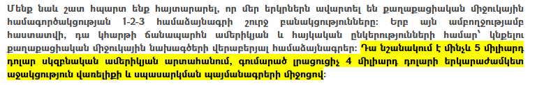 Փաստացի, նշվածից 5 միլիարդը միջուկային համագործակցության ոլորտում երկկողմ պայմանագրերի արժեքն է, և միայն 4 միլիարդն է ամերիկյան կողմի երկարաժամկետ աջակցությունը Հայաստանին։