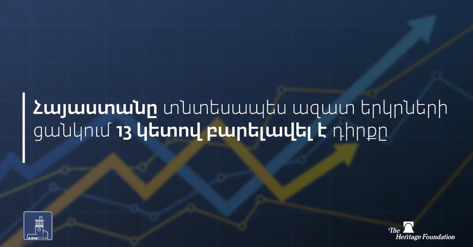 «Տնտեսական ազատության ինդեքս»-ով Հայաստանը մեկ տարվա ընթացքում բարելավել է իր դիրքերը 13 կետով՝ 180 երկրների շարքում զբաղեցնելով 34-րդ հորիզոնականը, «համեմատաբար ազատ» տնտեսություն ունեցող երկրից դառնալով «հիմնականում ազատ»։