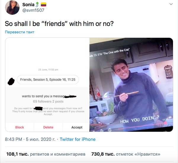 Sonia անունով օգտատերն իր թվիթերյան էջում կիսվել է մի զվարճալի դեպքով, երբ անծանոթ տղան փորձել է իր հետ ծանոթանալ համացանցում և դրա համար ընտրել է անսովոր մեթոդ։ Այն հաստատ դուր կգա «Friends» սերիալի երկրպագուներին։