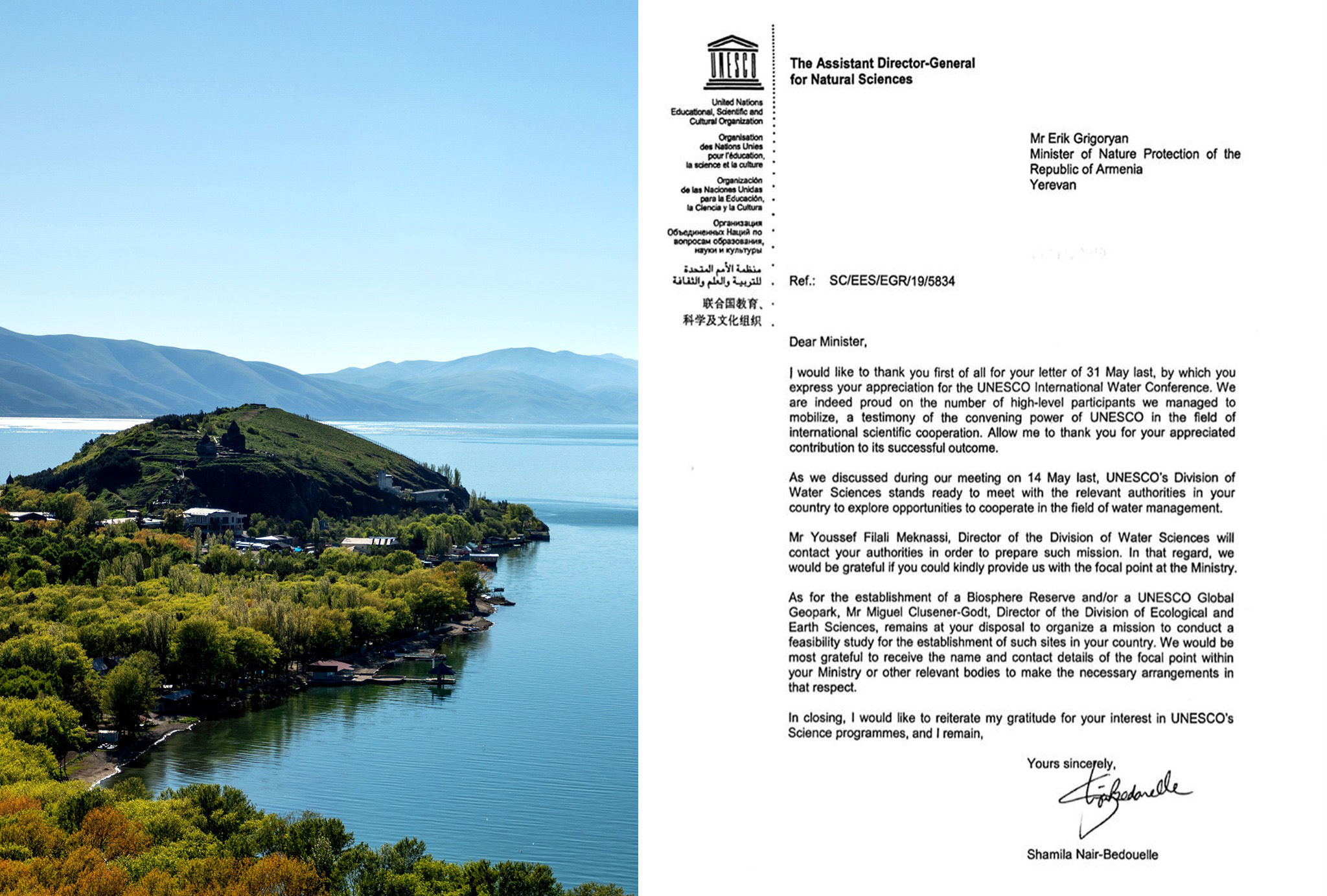 Շրջակա միջավայրի նախարար Էրիկ Գրիգորյանի՝ 2019թ. մայիսի 13-ից 15-ը Ֆրանսիայի Հանրապետություն կատարված գործուղման ընթացքում ձեռքբերված պայմանավորվածությունները վերածվել են գործնական քայլերի: Մասնավորապես, ՅՈՒՆԵՍԿՕ-ի գլխավոր տնօրենի բնական գիտությունների հարցերով տեղակալ տիկին Շամիլա Նայիր-Բեդուելի հետ ունեցած երկկողմ հանդիպումների ընթացքում քննարկվել էր ՅՈՒՆԵՍԿՕ-ի կողմից Սևանա լիճը և հարակից տարածքը որպես Կենսոլորտային պահպանավայր հաստատելու, ինչպես նաև Հայաստանում գեոպարկերի հիմնման հնարավորությունը: Տիկին Շամիլա Նայիր-Բեդուելի կողմից օրերս ստացված գրությամբ արդեն իսկ ազդարարվում է գործընթացի մեկնարկը: