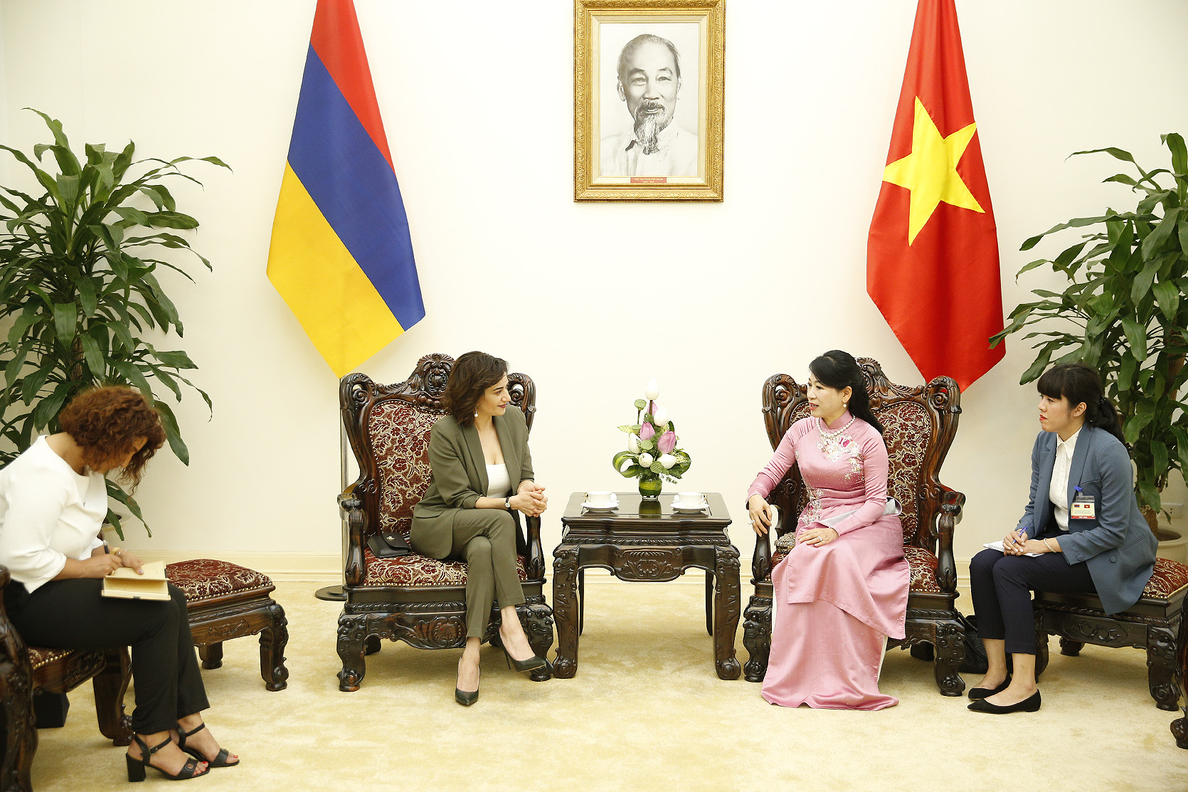 ‹‹Շատ շնորհակալ եմ ջերմ ընդունելության և հյուրընկալության համար։ Ձեր երկիրը հիասքանչ է, և ես իսկապես սիրահարվել եմ Ձեր քաղաքին։ Այն շատ գեղեցիկ է և շատ հարմարավետ։ Ես հիացած եմ Ձեր ժողովրդի հյուրընկալությունից։ Ես հույս ունեմ, որ Դուք և Ձեր ամուսինը ժամանակ կգտնեք և կայցելեք մեր երկիր։ Ես ձեզ հրավիրում եմ Հայաստան և վստահ եմ, որ ինչպես ես սիրեցի Ձեր երկիրը, Դուք էլ կսիրեք Հայաստանը››,- ասել է Աննա Հակոբյանը՝ հավելելով, որ փոխադարձ այցելությունները կնպաստեն ինչպես ընտանիքների, այնպես էլ երկու ժողովուրդների և պետությունների միջև բարեկամությանը։ Ի պատասխան Թրան Նգյուետ Թուին շեշտել է, որ Հայաստանն ու Վիետնամն ունեն դարավոր բարեկամություն և այսօր էլ պետք է ջանքեր գործադրել այդ հարաբերություններն առավել զարգացնելու ուղղությամբ։ ‹‹Մենք շնորհակալ ենք այն աջակցության համար, որ Հայաստանը ցուցաբերել է Վիետնամին ինչպես անկախություն ձեռք բերելու տարիներին, այնպես էլ հետագայում››,- ասել է Վիետնամի վարչապետի տիկինը։ Հանդիպմանը զրուցակիցները խոսել են կանանց դերի կարևորության և խաղաղության պահպանման մասին։