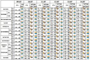 Հուլիսի 9-ին, 12-13-ը քաղաքի առանձին հատվածներում սպասվում է կարճատև անձրև և ամպրոպ: Հուլիսի 10-11-ը, 14-ին սպասվում է առանց տեղումների եղանակ։
