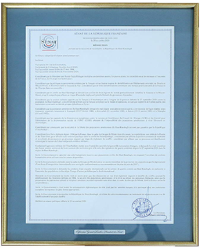 ԱԺ արարողակարգի թանգարանի վերջին ու կարևորագույն ձեռքբերումներից է Ֆրանսիայի Հանրապետության Սենատի նախագահ Ժերար Լարշեի գլխավորած պատվիրակության ժամանակ ստացած նվերը: 2020-ի նոյեմբերի 25-ին Ֆրանսիայի Սենատի ընդունած Լեռնային Ղարաբաղի Հանրապետությունը ճանաչելու վերաբերյալ բանաձևի բնօրինակը 2021-ի Ապրիլի 24-ի հիշատակի միջոցառումների շրջանակում հանձնեցին Հայաստանի Ազգային ժողովի նախագահ Արարատ Միրզոյանին: Եվ հետևաբար՝ այժմ այն պահվում է ԱԺ արարողակարգի թանգարանում: