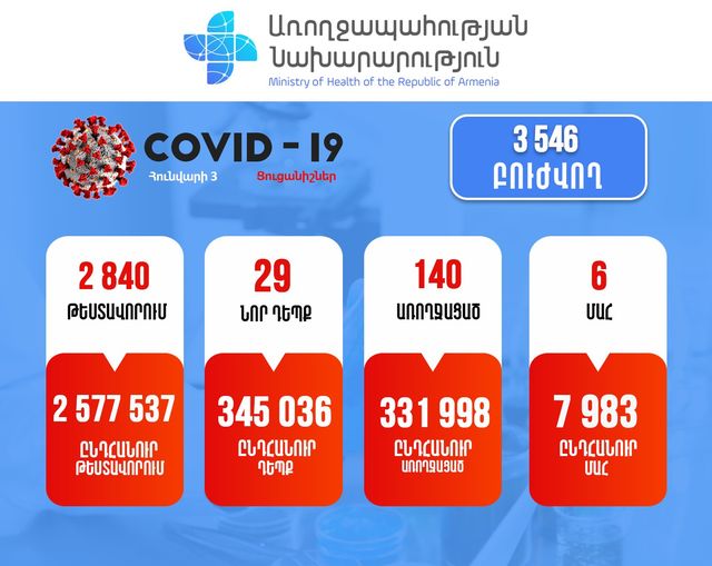 Հայաստանում հաստատվել է կորոնավիրուսի 29 նոր դեպք։ Առողջացել է 140քաղաքացի։ Մահերի թիվը 6-ն է։