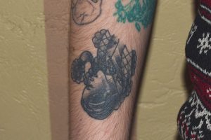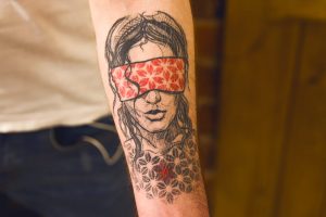 Девушка, изображенная на татуировке, — это не жена главного героя. Ее лицо просто эстетически мне понравилось. Мастер предложил мне несколько десятков случайных девушек, и я выбрал эту красавицу. Почему — не знаю. Уверен, если показать это психологам, они многое про меня скажут. Единственное совпадение — она не слепая. У нее повязка, которую можно в любое время снять.
