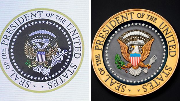 Но при ближайшем рассмотрении стало понятно, что в презентации главы США что-то было не так. Washington Post заметила, что президентская печать, появившаяся на экране, пока Трамп поднимался на сцену, была отредактирована и, казалось, высмеивала президента.