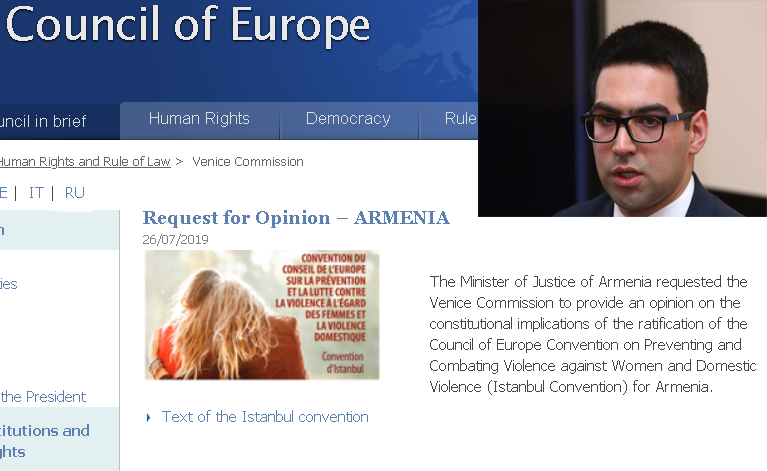 «Հայաստանի արդարադատության նախարարը Վենետիկի հանձնաժողովին խնդրել է եզրակացություն տրամադրել Հայաստանի կողմից Եվրոպայի Խորհրդի Կանանց նկատմամբ բռնության և ընտանեկան բռնության մասին կոնվենցիայի (Ստամբուլի կոնվենցիա) վավերացման սահմանադրական հետևանքների մասին», – նշվում է կայքում: