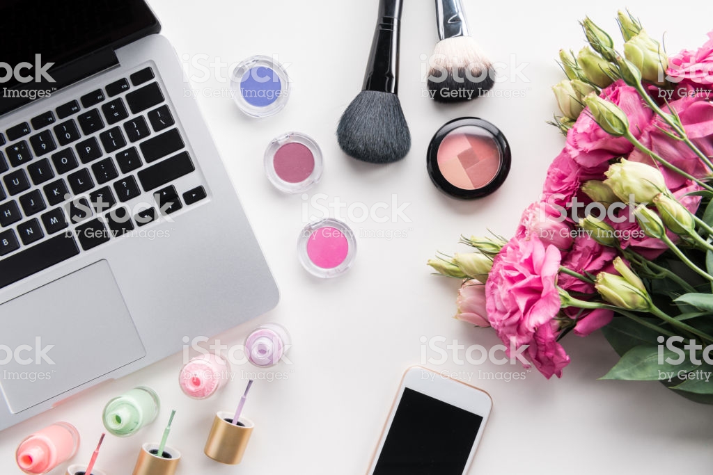flat lay with various cosmetics, bouquet of flowers, laptop and smartphone isolated on white