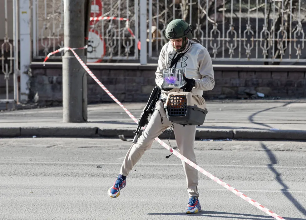 Կիևի զինված բնակիչը կատու և ձուկ է տանում ակվարիումում, որոնք փրկվել են ռմբակոծության տակ հայտնված տնից