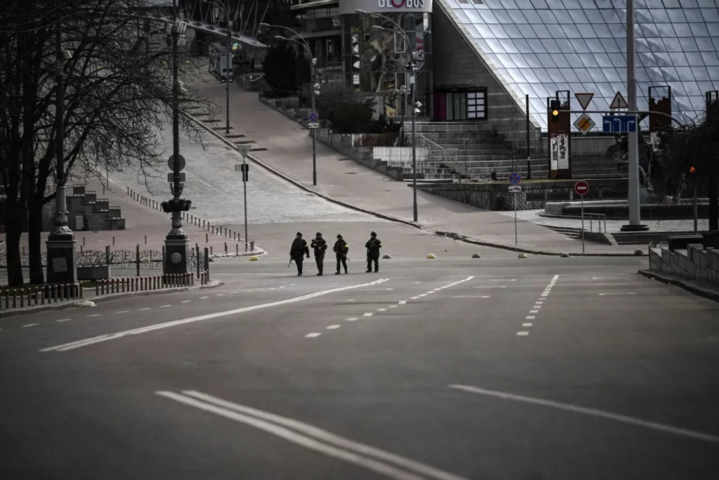 Զինվորական պարեկություն Կիևի կենտրոնում. Ժամը 17:00-ից 8:00-ն քաղաքում պարետային ժամ է, քաղաքային իշխանությունները հայտարարել են, որ օրինախախտներին կհամարեն «հակառակորդի դիվերսիոն-հետախուզական խմբերի անդամներ»։