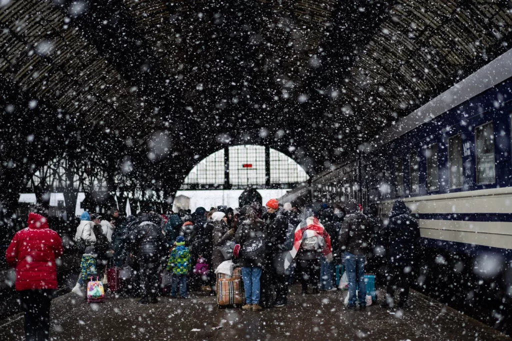 Լվովի երկաթուղային կայարանում փախստականները սպասում են գնացքներին Լեհաստան տարհանվելու համար։