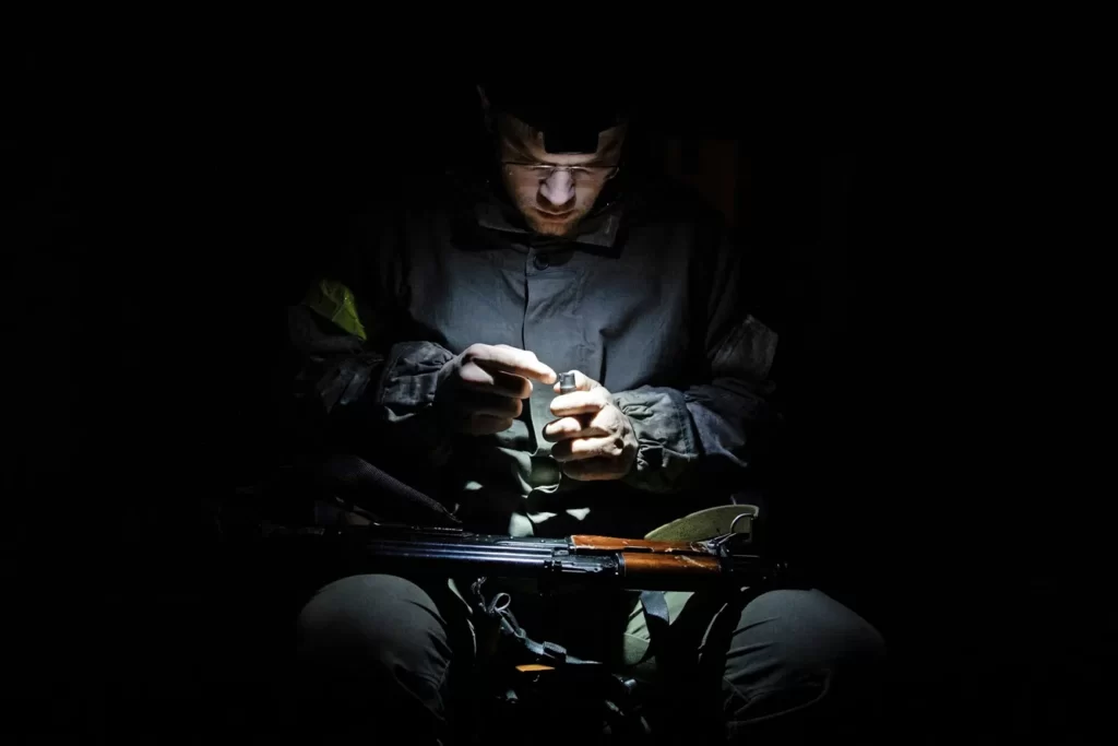 Ուկրաինայի ցամաքային պաշտպանության ուժերի մարտիկ Կիեւի անցակետում։