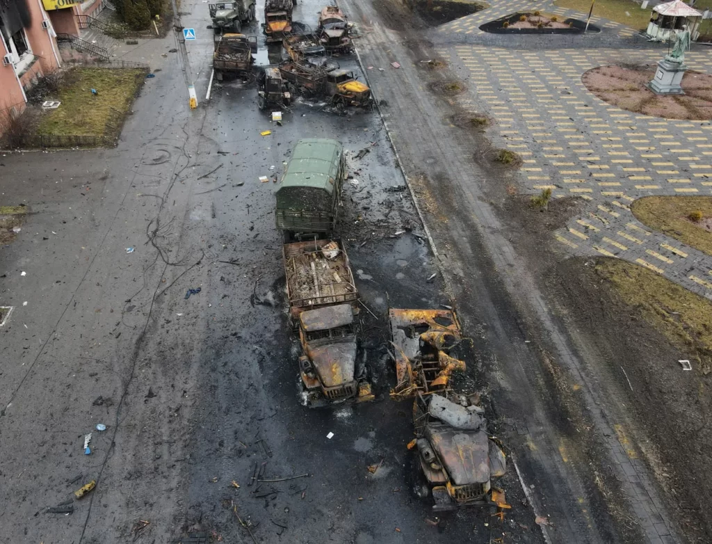 Կոտրված ռազմական տեխնիկան Կիեւի մարզի Բորոդյանկա գյուղում: Ռուսաստանի պաշտպանության նախարարությունը մարտի 3-ին հայտարարել է, որ Բորոդյանկան «միջանցք է տրամադրել քաղաքացիական բնակչության ելքի համար»: