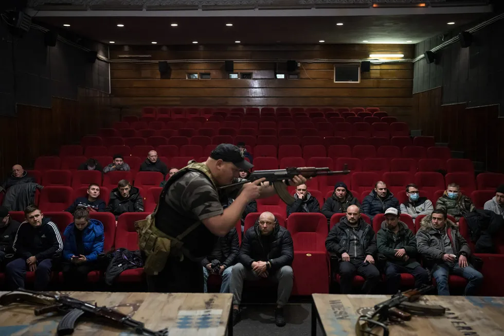 Ուկրաինացի կամավորները սովորում են զենքի հետ վարվել Լվովի կինոթատրոնի շենքում