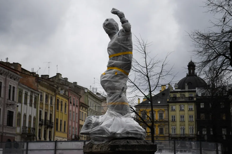 Լվովի արձանները փաթաթված են հրակայուն շերտով, որպեսզի պաշտպանեն դրանք հրդեհից և պատահական բեկորներից։