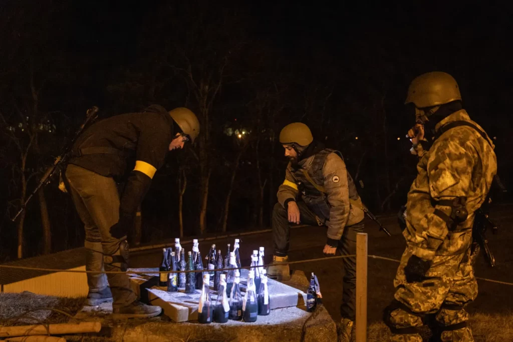 Տարածքային պաշտպանության մարտիկները պաշտպանում են Կիևի արևելյան ծայրամասում գտնվող բարիկադները և շաշկի են խաղում Մոլոտովի կոկտեյլներով։